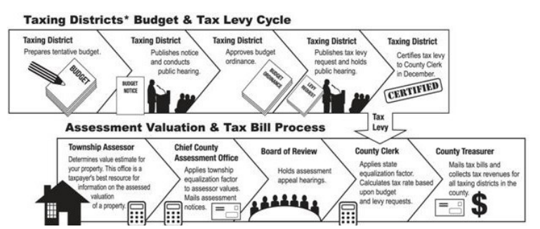 The property tax extension process is a complicated one that involves collaborative work between the local government bodies who levy taxes, Township Assessors, the County Supervisor of Assessments, the County Treasuer and the County Clerk. All parties involved must work together to make sure the property tax bills are sent out on time so that the local government who rely on those taxes to do things such as maintain roads, run schools, keep residents safe and healthly and provide services, get those tax dollars on time.